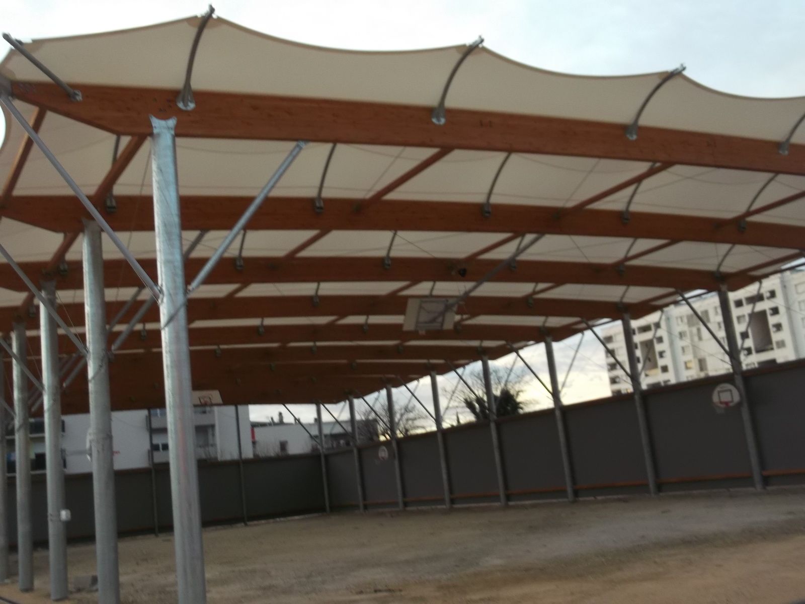 La couverture textile couvre la charpente sous laquelle sont suspendus des paniers de basket dont deux escamotables.