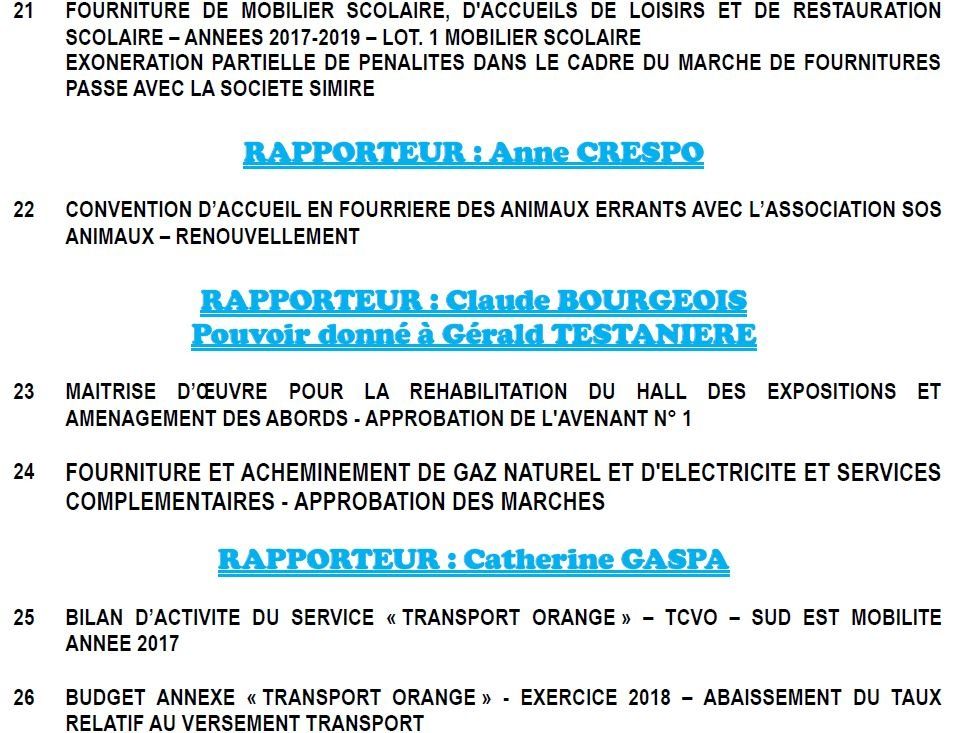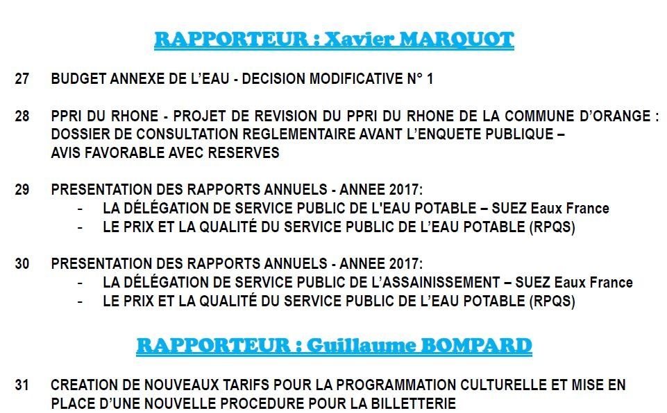 Ci après les points à l'ordre du jour du conseil municipal d'Orange du 29 juin à 9h00. Un conseil important avec le rapport DSU , le rapport de la délégation de service du théâtre antique/musée, le bilan du transport urbain, les rapports eau/assainissement.